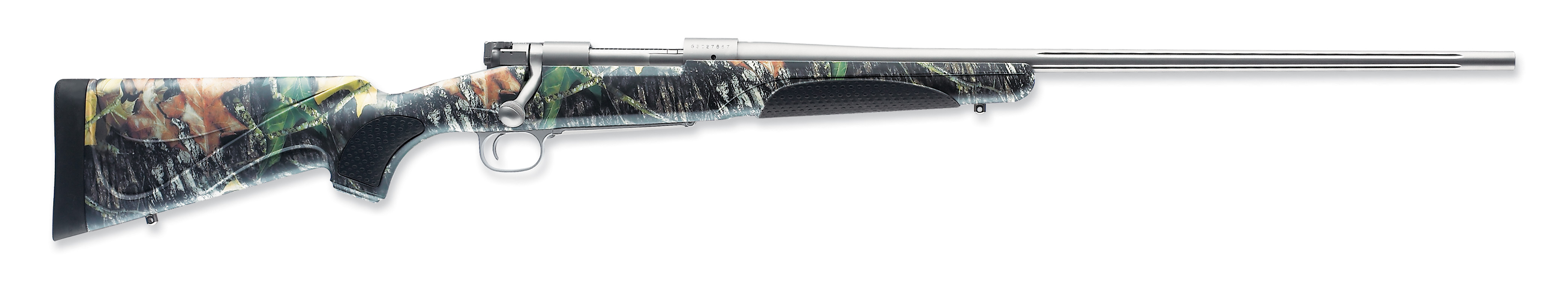Take a stainless steel Controlled Round Feed action, stainless fluted barrel, floorplate and internal components, and two-part epoxy bed them into a lightweight synthetic stock with oval-dot rubberized overmolded gripping surfaces. Then let it become part of your hunting environment with Mossy Oak® New Break-Up® camo and improve your wet-weather grip with its Dura-Touch® Armor Coating. Now you’ve got the ultimate Model 70 hunting machine, available in a variety of popular short and long action calibers.