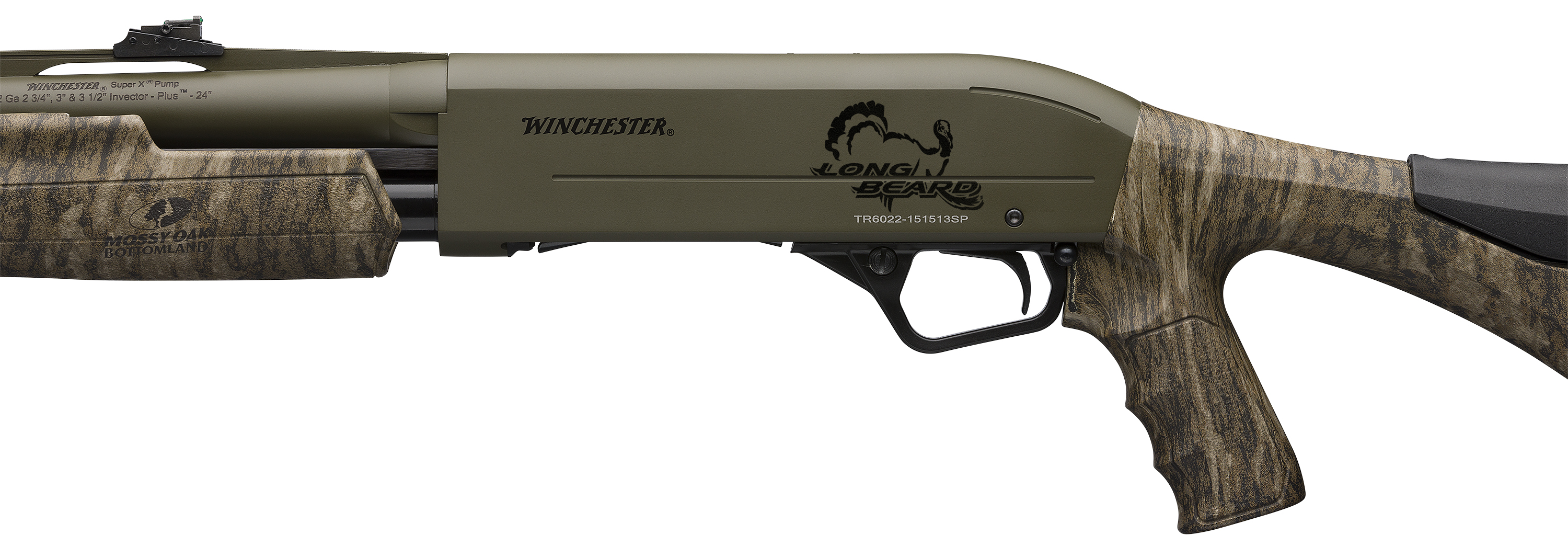 2023 SHOT Show Special – The ultimate turkey hunting pump shotgun. Pistol grip stock with spacers to adjust the length of pull and interchangeable comb height pieces. OD Green Perma-Cote and Mossy Oak Bottomland Finish. NWTF 50th Anniversary logo on receiver.